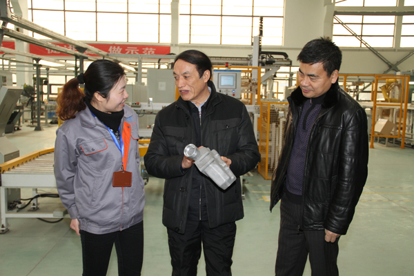 蒋吉生书记(中)了解我校智能工厂运行情况