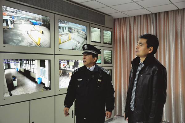 朱爱胜书记在安防监控室察看校园情况