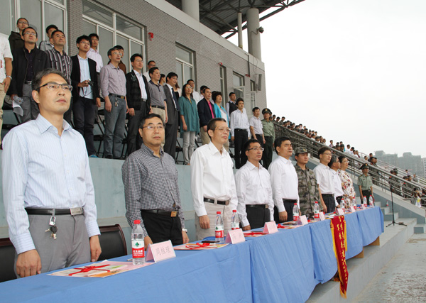 学生处副处长、人武部副部长吴斌主持大会,全体校领导、承担军训任务的人民解放军官兵、各院系负责人及新生辅导员参加了大会。在庄严的升国旗仪式后,校党委书记和部队领导检阅了受训队伍,2014级新生还进行了分列式、拉歌、军体拳、匕首操、格斗术汇报表演,参训教官也向同学们展示了擒敌拳等技能。