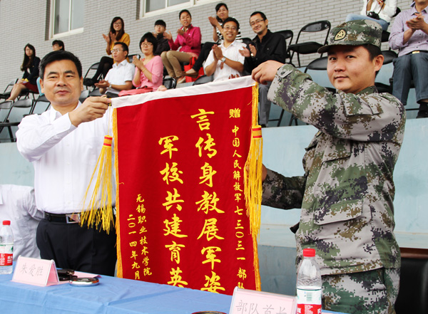 校党委副书记谈向群宣读了《关于表彰2014级学生军训先进单位和先进个人的决定》,16个连队和161名优秀学兵获表彰,校领导和部队首长向先进连队和个人颁发了奖状;校党委书记朱爱胜向承担我校军训任务的人民解放军部队赠送锦旗。副校长华坚对今年的军训工作进行了全面总结,代表学校向承担承训部队全体教官表示衷心的感谢和崇高的敬意,向圆满完成军训任务的全体新同学表示慰问和祝贺,并要求同学们将军训的收获和成果巩固下来,贯穿到今后的学习和生活中,努力把自己培养成全面发展的高素质人才。(魏艳王卫东高凤)