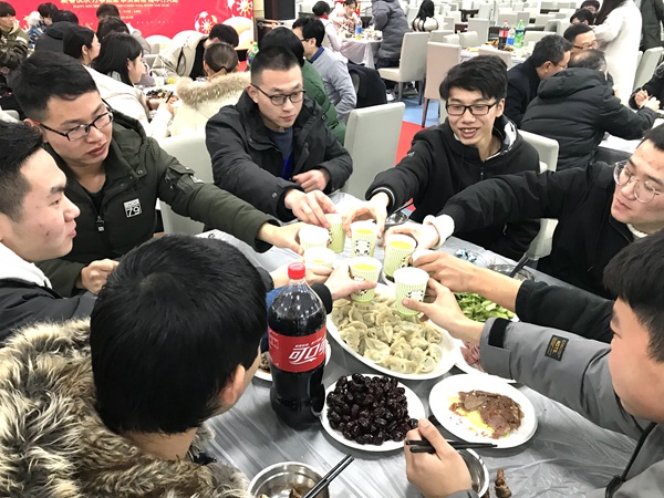 2月2日,学校教工食堂张灯结彩,处处洋溢着新年的祥和气氛。校党委书记朱爱胜、副校长杨雪琴与部分分院党总支书记、学生处、团委、国际教育学院、后勤处的老师一道,与寒假留校的200多名中外学生共用团圆晚饭,共迎新春佳节。