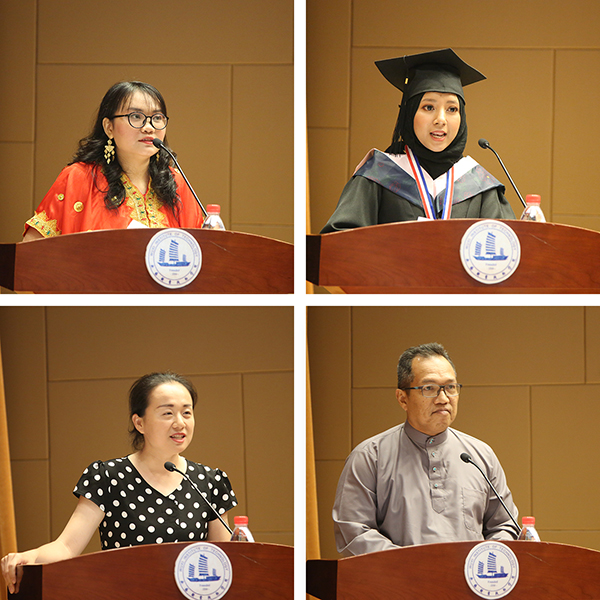 朱爱胜书记在毕业贺词中向2019届留学生毕业生顺利完成学业表示祝贺,鼓励毕业生用所学的知识与技能为自己国家的发展作出贡献,努力成为国际友好传播使者,促进中外文化交流。马来西亚管理与科学大学副校长Eddy Yusuf先生、印尼特里萨克迪运输与物流学院副校长Juliater Simarmata先生对同学们顺利完成学业表示祝贺,并高度认可我校的外国留学生培养工作,就进一步加深与我校稳固的合作表达了意愿。吴慧媛副校长宣读了优秀毕业生、结业生、毕业生的相关决定。龚方红校长为毕业生一一行拨穗礼、颁发毕业证书、赠送纪念品,并合影留念。