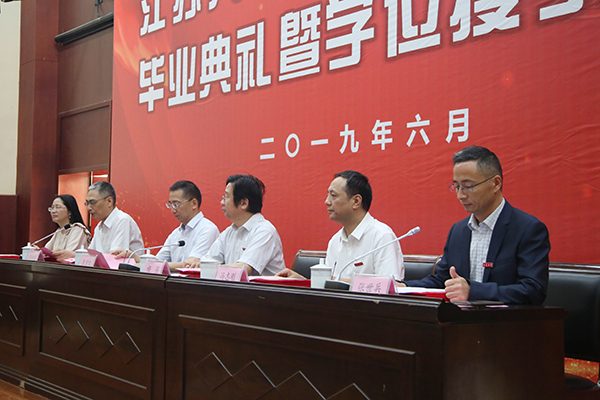 龚方红校长在毕业贺词中回顾了2019届高职本科生在校期间取得的重要成绩,代表母校送上了他的嘱托,寄语同学们要不忘初心,坚持自我;热爱生活,悦纳自我;秉承匠心,实现自我。机制11541班陈占富同学作为毕业生代表发言,管理学院于云波教授作为教师代表发言。江苏大学梅强副校长在毕业致辞中介绍了江苏大学近年发展成就和联办高职本科项目建设成果,对毕业生提出了新的希望,希望同学们有“敢教日月换新天”的青春豪气,有“踏平坎坷成大道”的青春锐气,有“各领风骚数百年”的青春才气。
