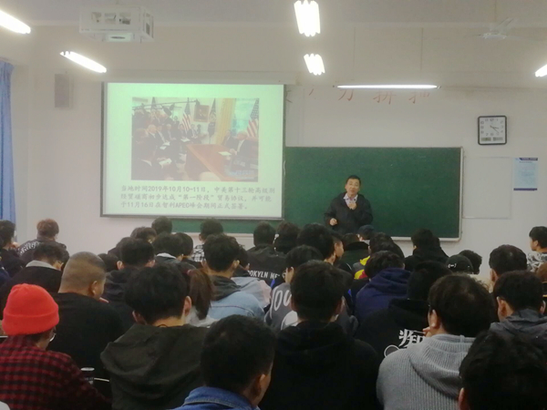 朱爱胜书记和龚方红校长在讲课中为同学们梳理了中美贸易摩擦的背景与演变过程,以详尽的数据资料和严谨的逻辑分析为大家阐释了中美贸易摩擦的原因与影响。在讲到中美贸易摩擦的对策时,他们指出,面对激烈的国际竞争,我们要增强信心,敢于竞争博弈,保持定力,不断深化改革,积极推动科技创新,坚持扩大开放,融入世界经济。校领导们在讲课中还结合同学们的学业提出,未来国力的竞争必将归结为科技的竞争,“科学技术是第一生产力”这句话永远不会过时,所以要学好专业课,为国家科技创新做出贡献。在授课过程中,校领导们注重在内容上加强正面引导,突出爱国主义教育,在方法上积极与学生互动,展现独特的教学魅力。