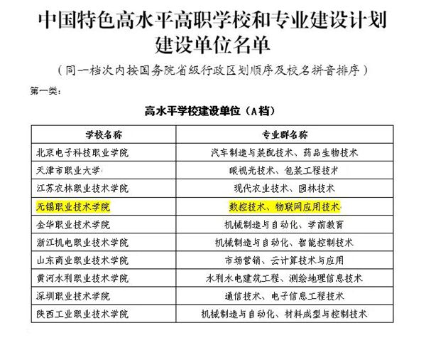 12月18日,教育部、财政部发文公布“中国特色高水平高职学校和专业建设计划建设单位名单”。我校成功入选全国前10名高水平学校建设单位(A档),进入国家“双高计划”中的第一方阵。