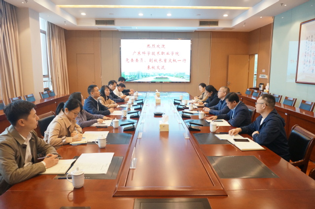强伟纲副校长对广东科学技术职业学院各位领导的来访表示热烈欢迎,并从办学概况、发展思路、主要举措等方面对我校基本情况进行简要介绍。他指出,双方具有良好的合作基础和广阔的合作前景,希望双方以此次交流为契机,不断凝聚共识、互相学习,持续深化在科学研究、师资队伍建设等方面的合作,进一步深化友谊、共谋发展。
