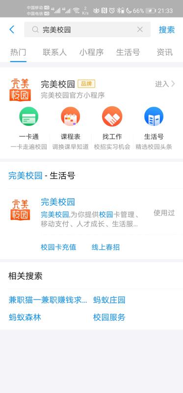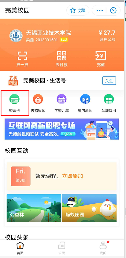 校园电子卡包与使用校园实体卡的作用是一样的,使用校园电子卡包消费时,进入“完美校园”。