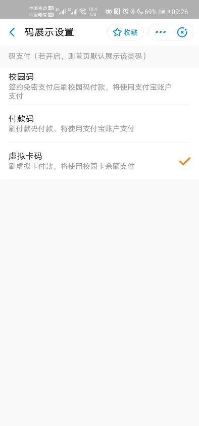3、如果付款时想优先使用虚拟付款码(校园卡内余额),可以进行如下设置:在“完美校园”——“我的”——“设置”——“支付设置”——“虚拟卡码”即可,回到“完美校园”首页面点击“去付款”,打开就是虚拟卡码付款。