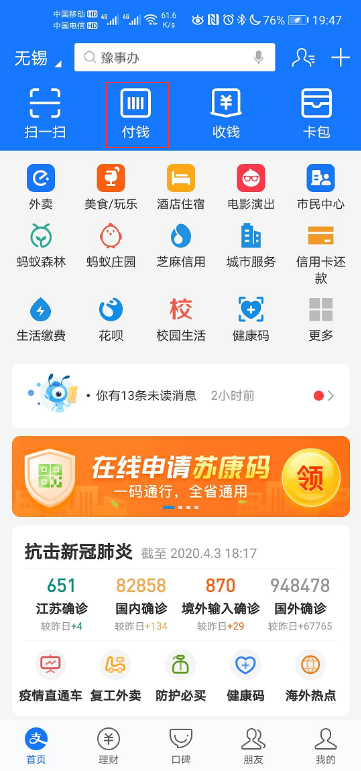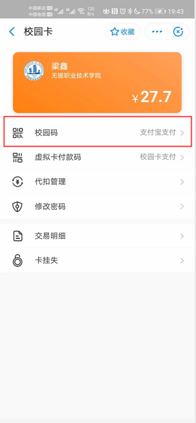 (2)点击“校园卡”——“校园码”使用“支付宝”消费,“校园码”支持双离线状态支付。