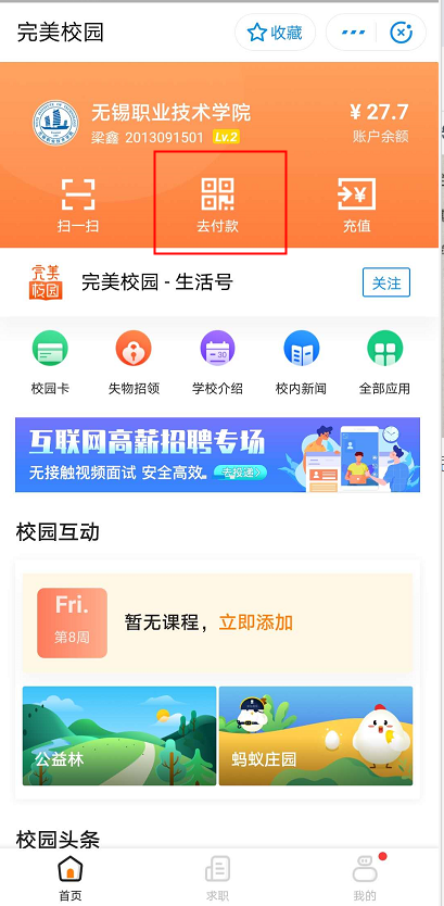 (3)点击支付宝的“付钱”和完美校园“去付款”,两者都是支付宝付款。