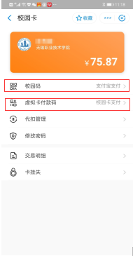 (1)点击“校园卡”——“虚拟卡付款码”,使用校园卡余额消费,如果卡上余额不足,是不能完成交易的,可以在页面点击“充值”后付款,如下图