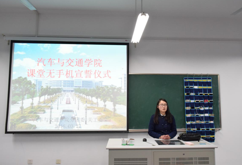 为了提高同学们的课堂学习效率,形成优良的学风、班风气氛,营造文明校园、文明课堂的氛围,在分院老师的指导下,2015级全体同学开展了“无手机课堂”的宣誓活动。2016年3月27日18时,青马工程学员又进行了课堂无手机宣誓活动。此次活动由分团委魏可同学主持。
