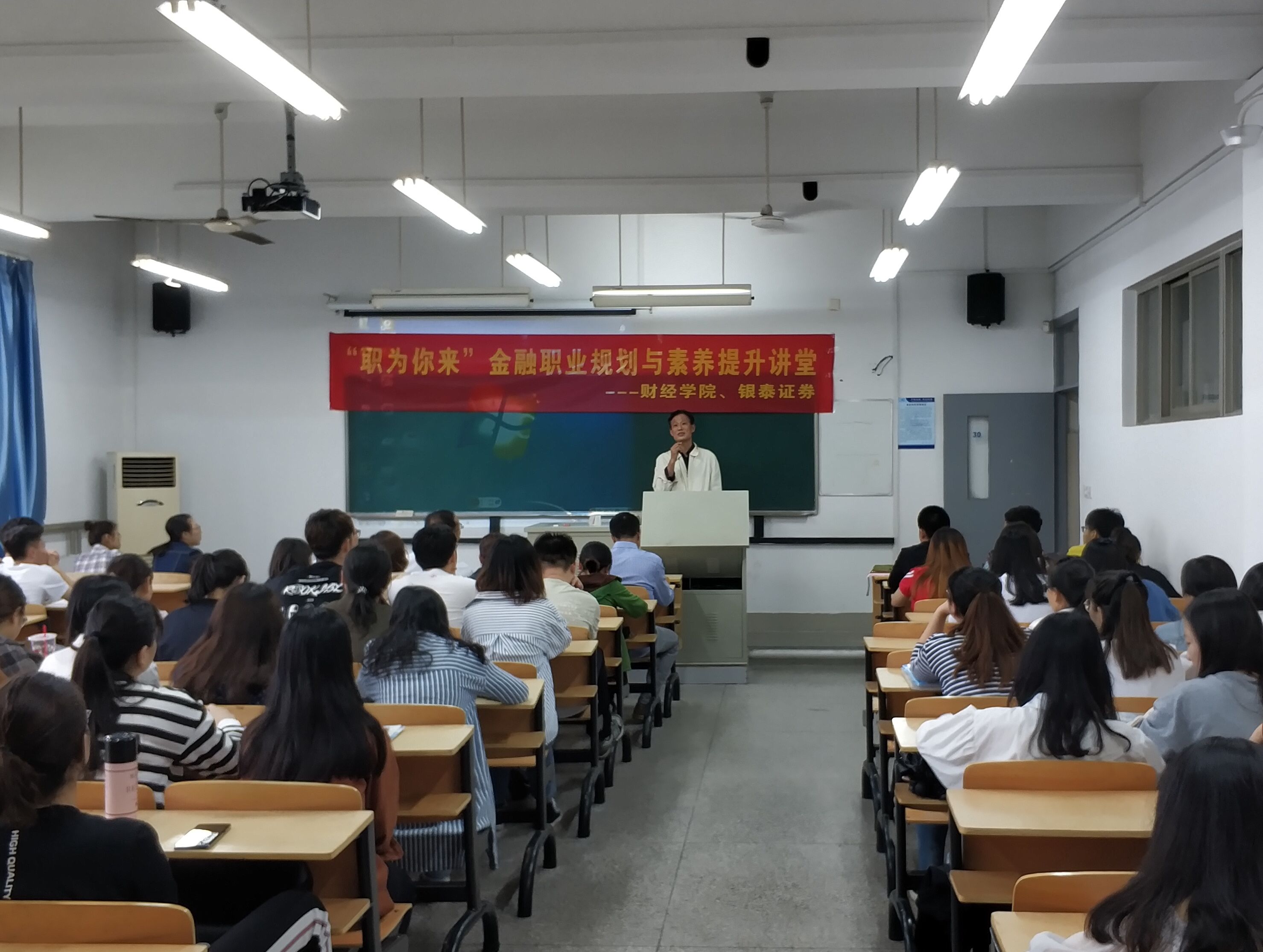 5月22日,玛雅吧财经学院关工委、学生办举办的“职为你来”金融职业规划与素质提升讲堂在明德楼C301开讲。银泰证券股份有限公司江苏分公司总经理王正洋担任主讲嘉宾,财经学院成康康、谢国萍、路晓丽老师以及金融、财会专业共80名同学参加了本次活动。