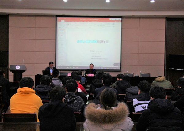 此次讲座以“走向人生职场的法律关注”为主题,以促进学生学法、知法、守法为目的,吴主任围绕《中华人民共和国劳动合同法》、《中华人民共和国婚姻法》、《中华人民共和国继承法》等法律条文为,以生活中的真实事件为例,深入浅出的为学生讲解了相关的法律知识,尤其针对准备就业的2020届毕业生着重梳理了在签订就业协议及劳动合同时需要注意的问题,包括实习期限的界定,工作时间的安排、合规的解约手续的办理流程,讲座中满满的“干货”,受到了在场学生的一致好评。通过本次讲座,学生对法律知识有了更新、更深的认识,懂得了在今后的工作生活中怎样规范自己的言行,并学会用法律武器维护自身合法权益。