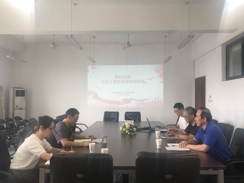 2021年6月7日校关工委常务副主任华坚、校关工委秘书长江铭,赴外语与旅游学院就二级关工委优质化建设进行调研和指导。外语与旅游学院党总支书记郭再泉,党总支副书记周嫄和辅导员沈国农出席会议。
