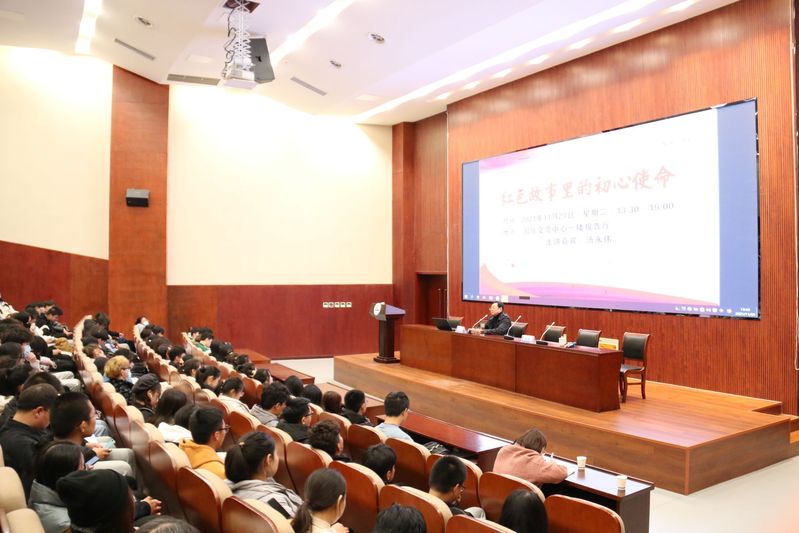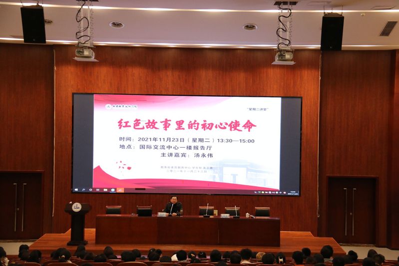 11月23日下午13:30—15:30在国际交流中心一楼报告厅开设了题为《红色故事里的初心使命》的专题讲座,红色烈士后代汤永伟主讲,校关工委秘书长江铭主持,近400名师生代表到场学习。