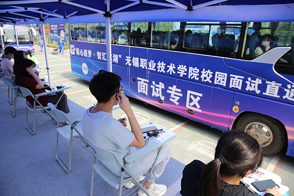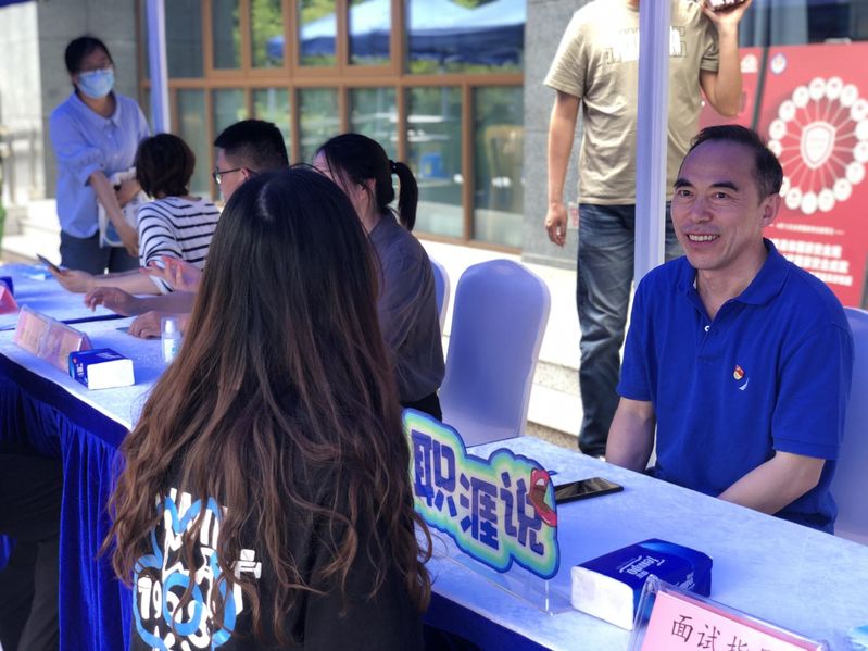 现场,载着企业HR的“面试大巴”开进学校,大巴车一面开拓成面试窗口,车窗上印有企业信息。招聘人员采取全程不下车、通过语音对话系统“隔窗面试”的方式开展线下招聘。学生浏览企业岗位介绍并扫码报名面试,将简历送至现场工作人员处,简历由工作人员统一送至面试大巴。学生领取面试号后在等待区域等候面试,现场搭建起1米高面试台,让企业HR与学生交流时处于同一高度,做到了面对面,但不接触。现场还搭建了简历投递站、简历打印站、就业指导站、医疗服务站、征兵咨询站和职业生涯辅导站,关工委老师为毕业生职业生涯适应、简历优化、职业决策等生涯和求职困惑开展一对一辅导,提供就业政策解读和指导,为毕业生提供现场周到服务。