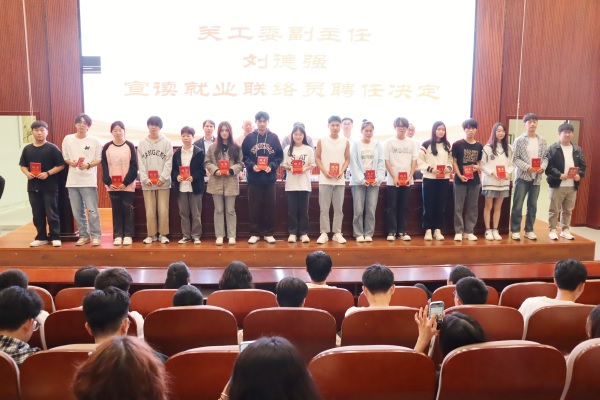 物联网技术学院关工委副主任刘德强老师宣读了2024届36位就业联络员聘任名单,并向他们颁发聘书,希望他们发挥自身优势,深入学生群体,为毕业生提供精准就业信息传递及就业帮扶指导服务,促进毕业生积极主动就业。