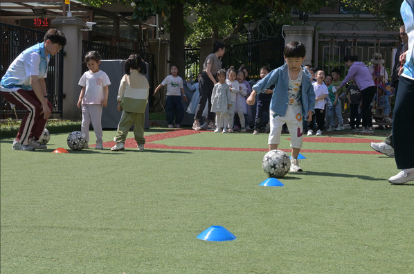 活动过程中,常华老师和志愿者一起带领小朋友们分别进行了户外足球赛、儿童手势舞、缤纷粘土画和手工植物拓染四个主题活动。在户外足球赛中,常华老师对踢足球的基本动作、以及如何带球过障碍物进行了详细的讲解和示范,重点强调了踢足球时安全注意事项,然后带小朋友们做了热身运动,确保运动过程中的安全。随后志愿者们组织小朋友们分组比赛,让他们在实际比赛中感受足球的魅力,培养团队合作精神。