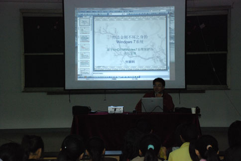 2009年11月10日,中桥实验楼一楼阶梯教室座无虚席,经管学院电子商务专业何新科老师为学生做了《打造金刚不坏的WINDOWS――基于VHD的win7》的专题讲座。何老师从大家在开设网店,使用电脑过程中普遍遇到的系统崩溃、中病毒等情况谈起,从理论和实战两个方面讲述了如何做好系统的维护工作,确保电子商务活动的正常开展。讲座吸引了近300名学生参加,大家纷纷反映收获颇丰。