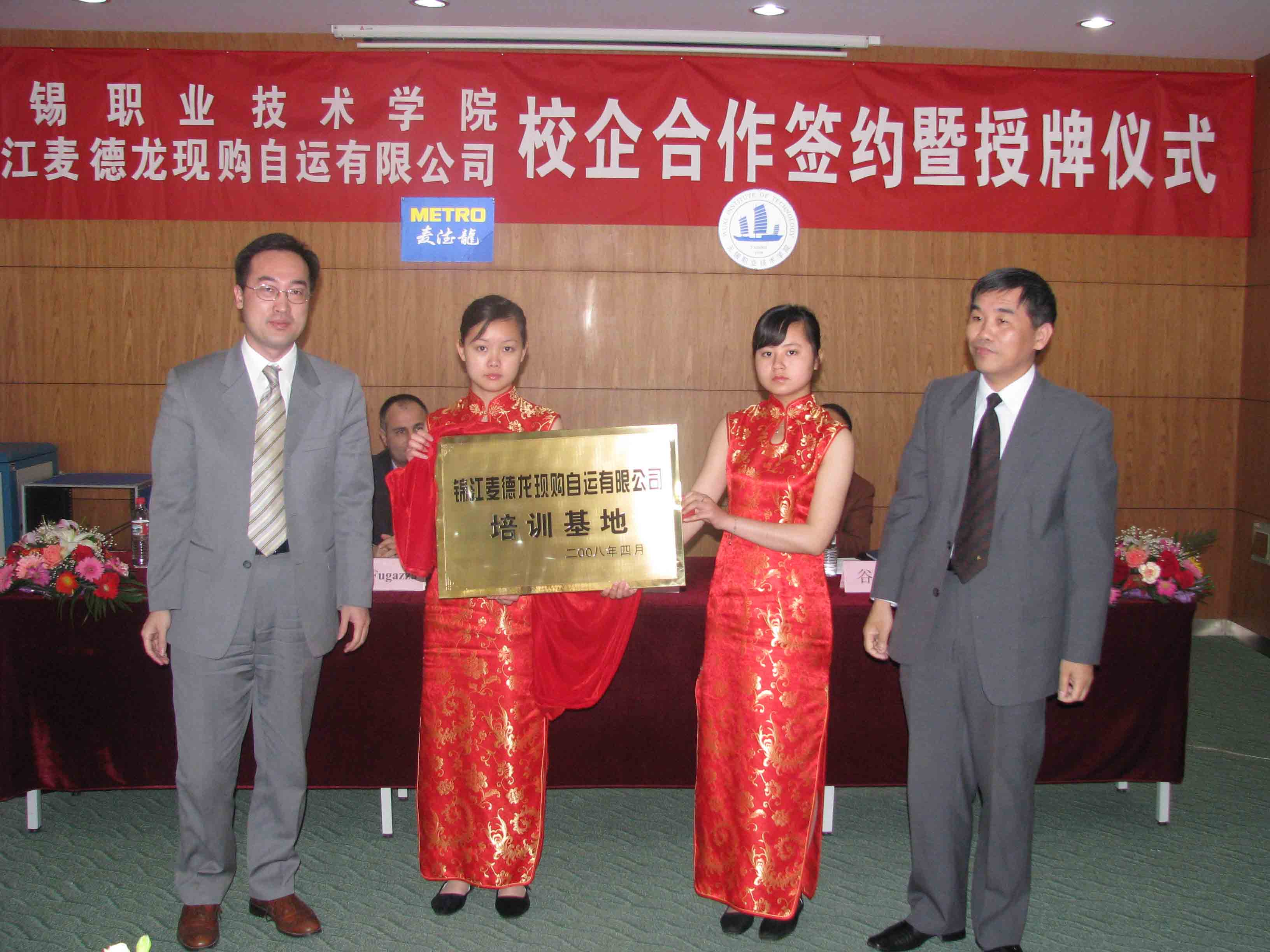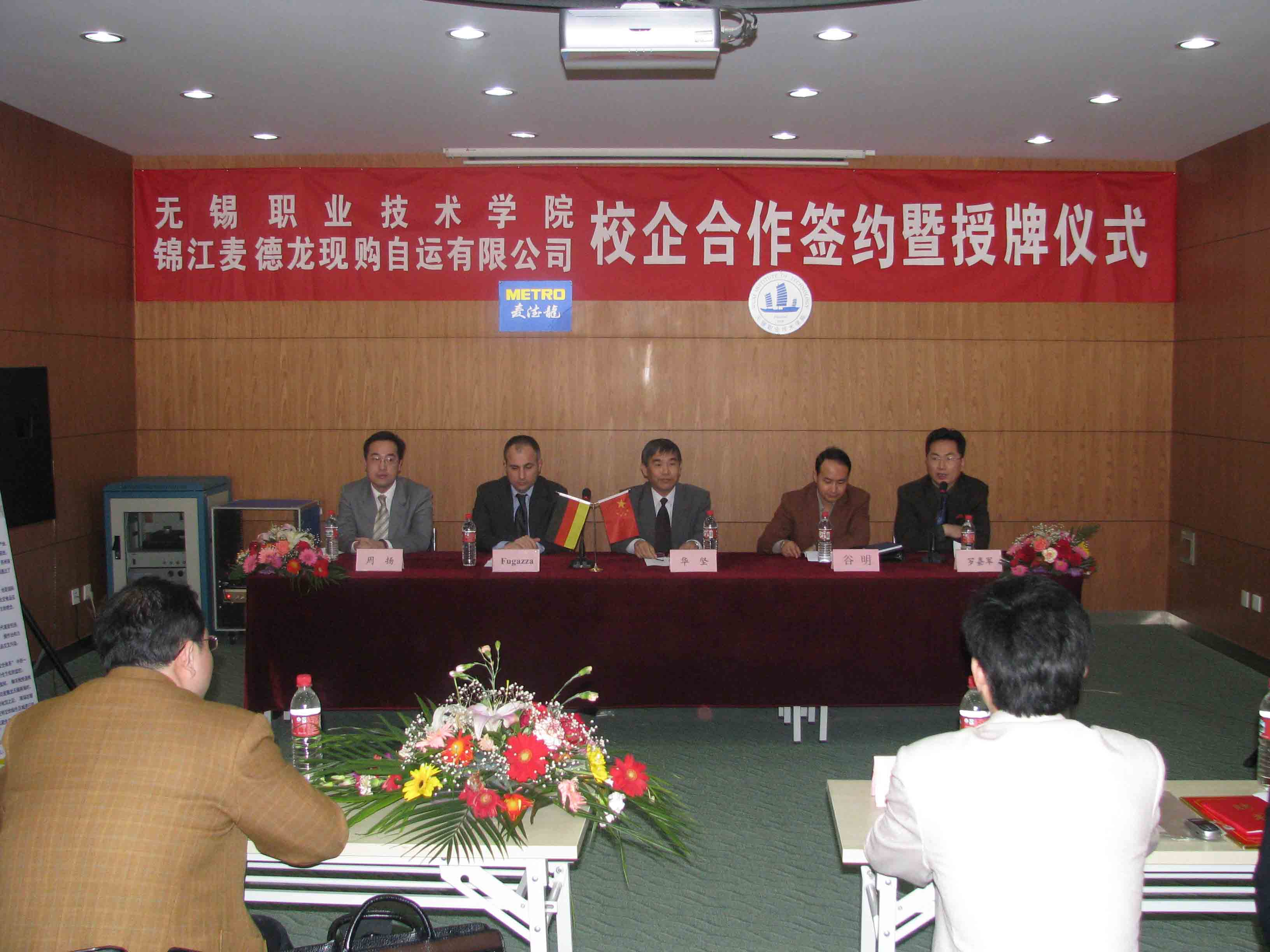 首先学院副院长华坚对校企合作的重要性以及学院的概况进行了介绍,对于锦江麦德龙与学院长期以来的良好合作表示了肯定,并对本次签约暨揭牌仪式表达了美好的祝愿。锦江麦德龙华东区销售经理 Fugazza 回顾了麦德龙在中国 11 年的发展史,并表达了将与学院共建合作平台:参与物流管理等专业的人才培养模式改革;依托学院进行员工培训;开设“麦德龙班”并设立“锦江麦德龙奖学金”等合作细节。锡山区人事局领导谷明也做了重要讲话。他介绍了目前的人才需求形势,希望更多的企业能够参与高职教育,校企共赢。
