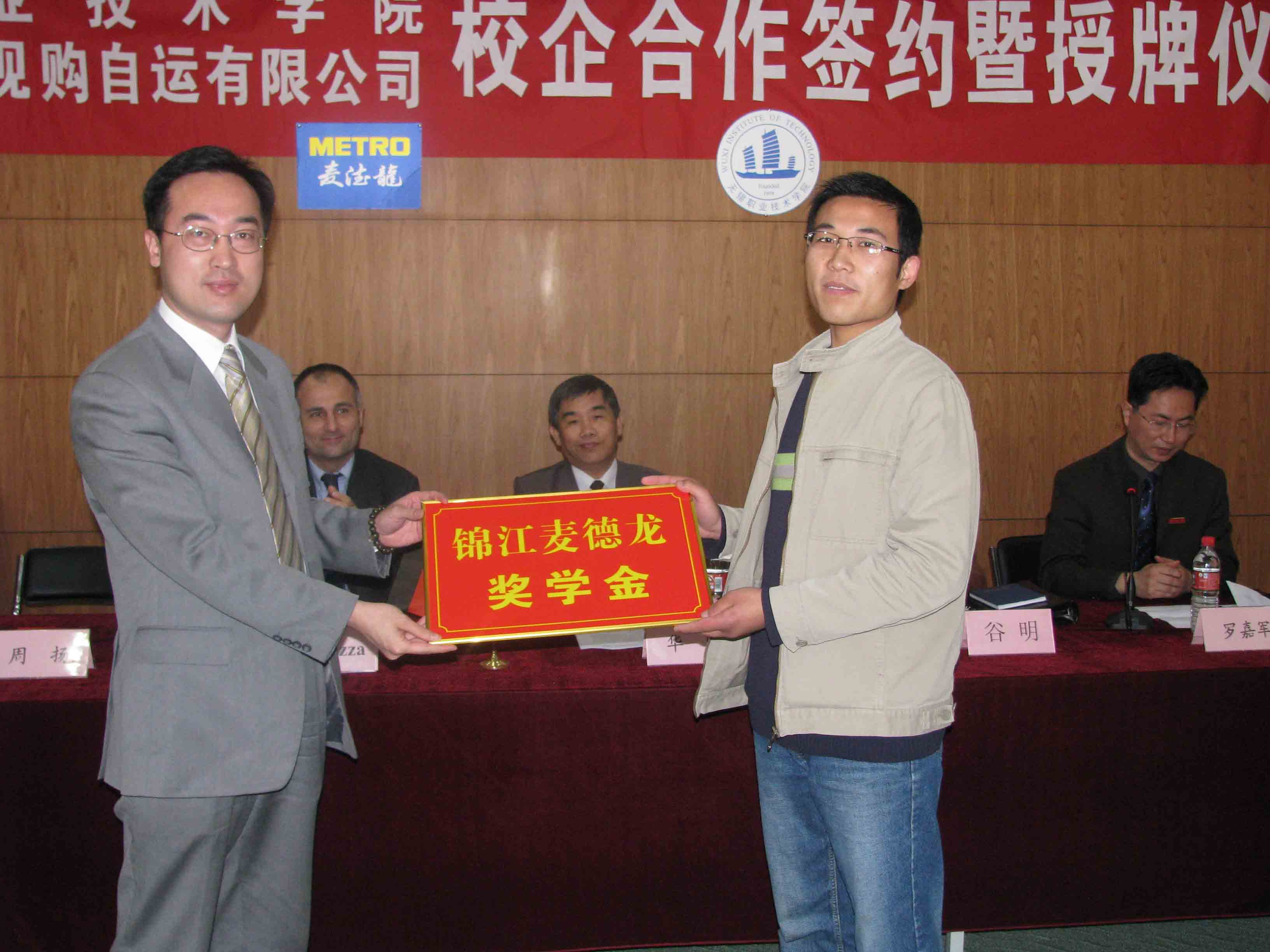 华坚副院长代表学院与锦江麦德龙签署了校企合作合作协议并进行了揭牌仪式。学院同时聘请麦德龙现购自运有限公司锡山商场经理 周扬 先生作为客座教授,并现场颁发了“锦江麦德龙奖学金”。会后,双方代表互赠了礼品。