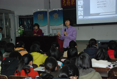 宣讲会邀请了全国创业培训工作指导委员会创业实训项目专家办公室专家、全球模拟公司联合体中国(无锡)中心负责人刘琨女士为在场学生介绍了创业实训“模拟公司”项目。模拟公司创业实训在“做”中学的核心理念引起了学生们极大的兴趣,现场还通过互动的方式请五位同学对自己进行了一分钟的自我介绍,让学生们体验企业模拟面试的环节,整个会场座无虚席,气氛热烈,上下互动,让学生们感受到了与以往不一样的讲座。参加宣讲会听讲的学生普遍反映,通过听讲,对大学生创业实训的认识有了质的飞跃和清醒的目标, 同时增强了大学生创业的信心和勇气。
