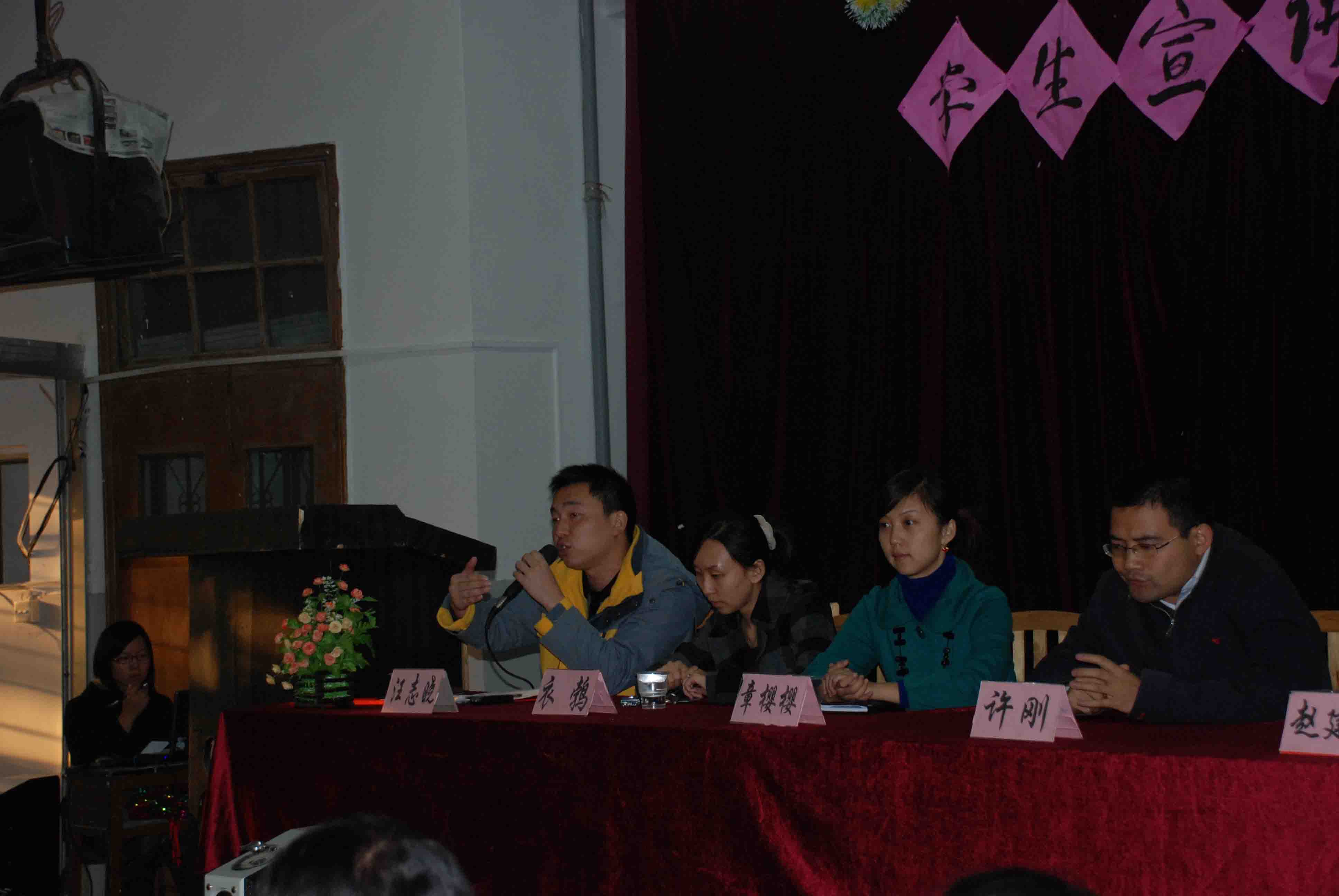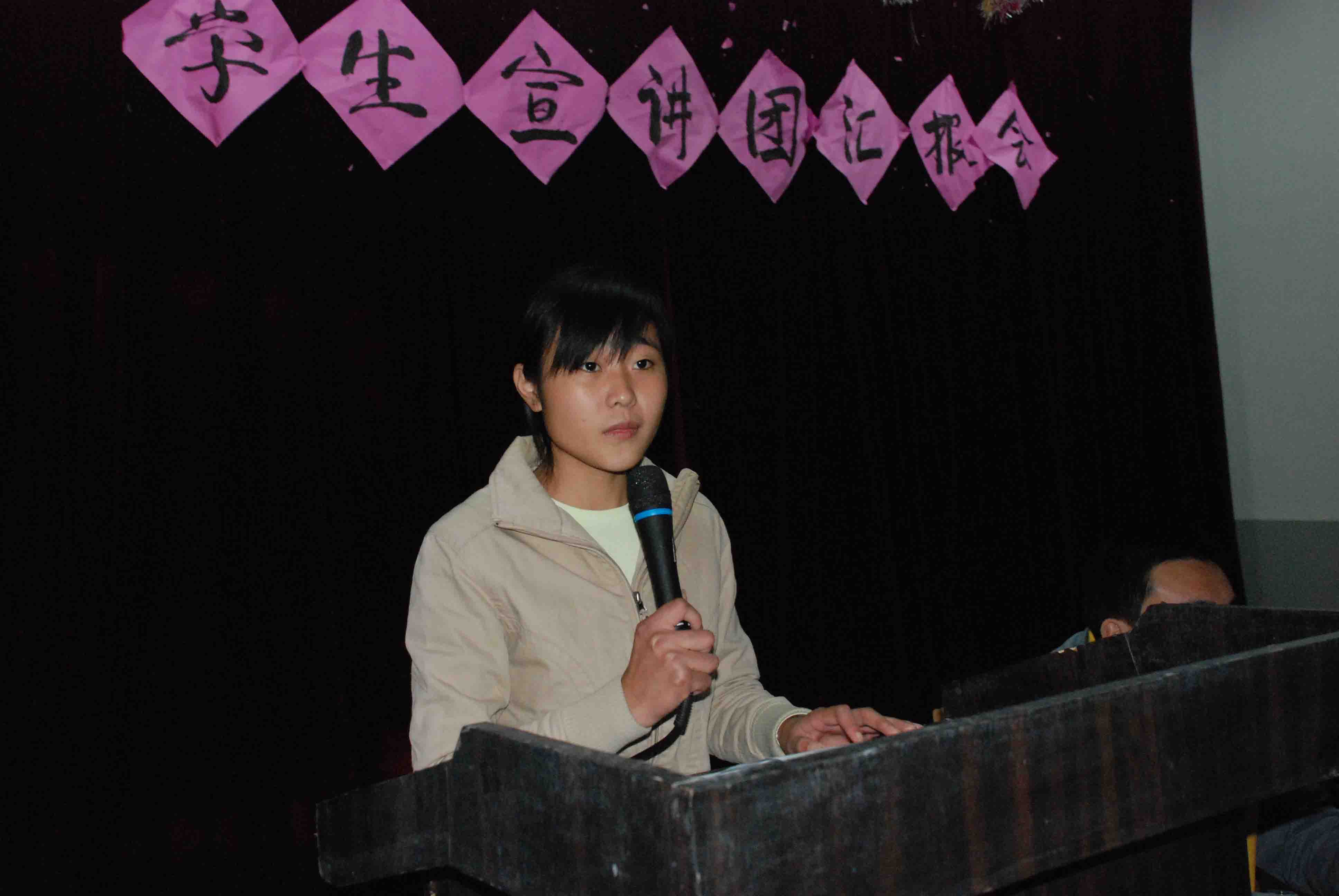 2008年11月11日,经济管理学院党总支在实验楼一楼阶梯教室举行党的基本知识培训暨学生党员宣讲团先进事迹报告会。来自电商40831、旅游40831、旅游40801、国贸40831的近200名同学参加了汇报会。会议由经管学院党总支党务秘书汪志晓老师主持,学生支部的部分老师和部分新生班主任参加了会议。学生宣讲团成员赖春施、谢晴晴、王思伟、顾士心四位同学分别上台讲述了自己自递交入党申请书以来在思想、学习、生活等各方面的成长经历,宣讲了作为一名学生党员如何发挥先锋模范作用,帮助周围同学一起进步的事迹。宣讲结束后汪老师给大家做了党的基本知识方面的培训,并针对大家关心的入党程序问题做了讲解。