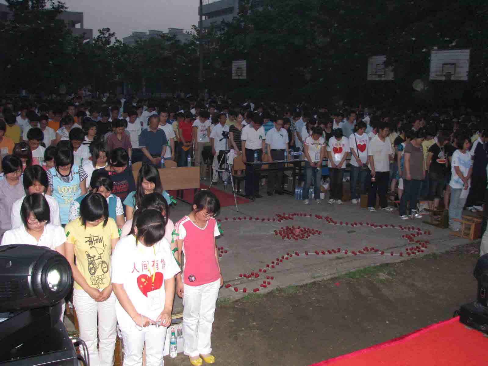 图二 参加晚会的全体师生向四川汶川大地震遇难同胞默哀1分钟
