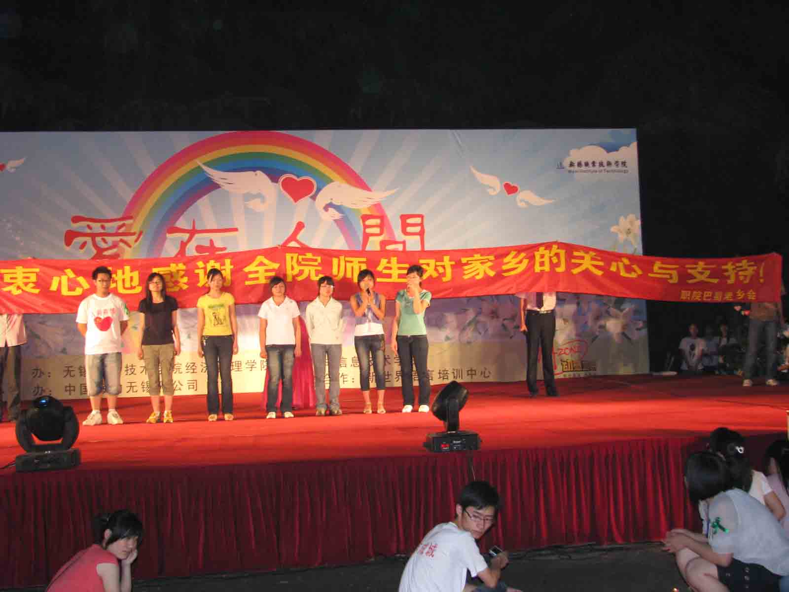 这场晚会一个最大的亮点就是分院师生对四川汶川大地震的关切,强烈表达了师生对灾区人民的深切关怀与支持灾区重建家园的热情。诗朗诵《爱的奉献》、《我们与你同在》、情景剧《爱在人间》等等再现了抗震救灾一线的动人事迹与大家对遇难同胞的思念与生者坚强的愿望,并支持灾区重建家园的心情。表演中,师生们个个真情流露,声情并茂,热泪盈眶。他们的表演深深的打动了每一个台下观众。