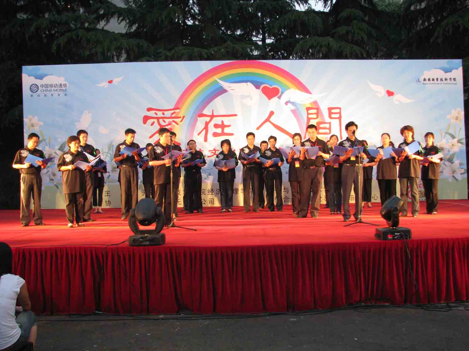 5月29日晚,以五四、赈灾、奥运为主题的“爱在人间”文艺晚会在中桥校区东篮球场隆重举行。晚会由经管学院主办,得到了电信学院、中国移动以及新世界语言培训中心的大力支持。院党委书记傅筠、副书记于学甫、院老领导韩亚平,院学生处有关领导以及电信学院领导郭再泉、周志德应邀出席了晚会。