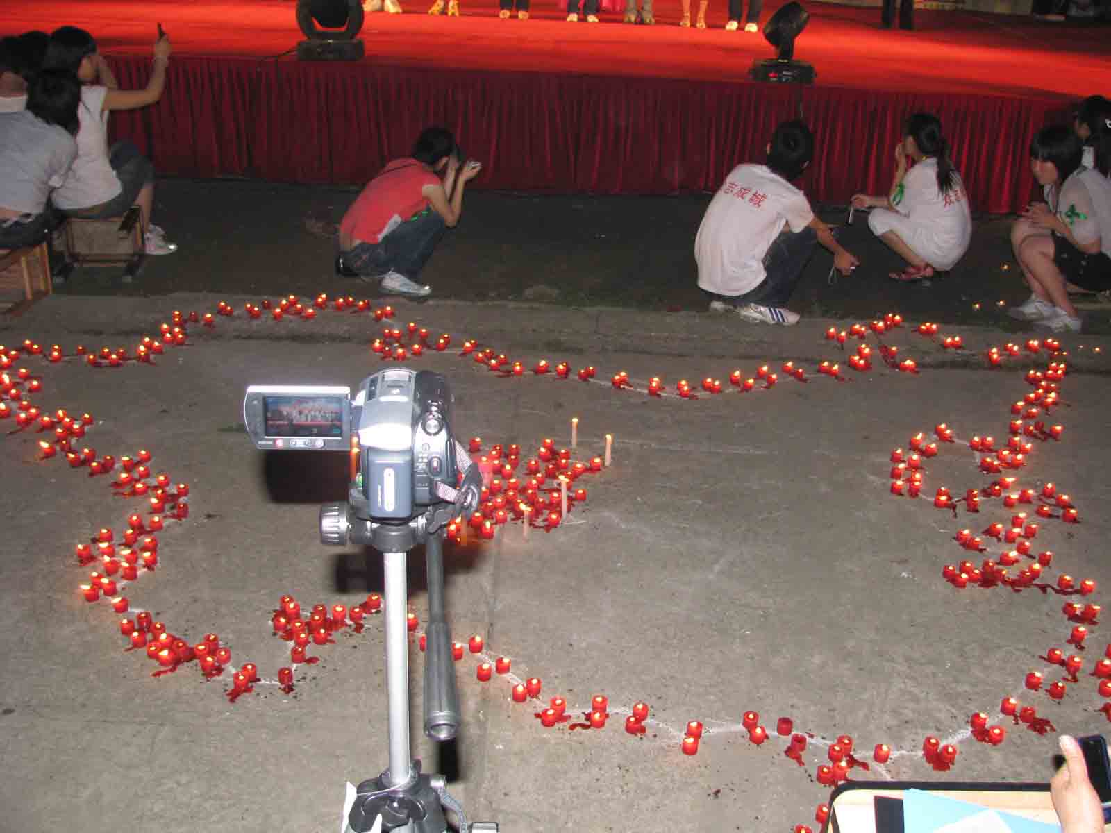 图四 学生们用烛光点了中国的地图和四川的位置,寄托师生们对四川汶川大地震逝者的悼念。