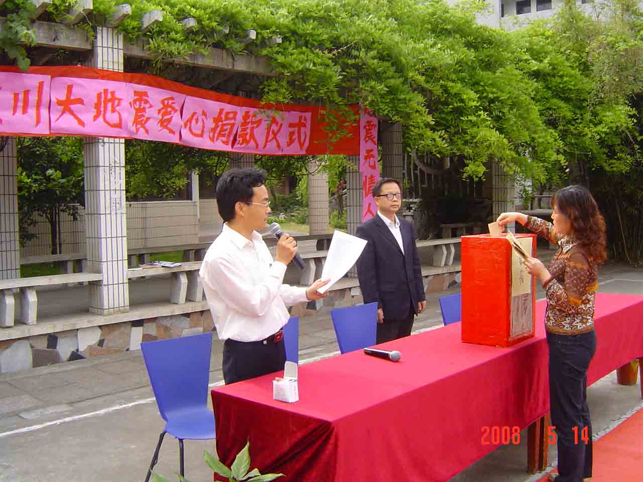 地震无情人有情,万众一心渡难关。四川汶川地震造成人民生命和财产的巨大损失,无时无刻牵动着广大师生的心。5月14日下午3:30,中桥校区在西篮球场举行了题为《汶川大地震爱心募捐仪式》。会上,首先由电信学院院长周志德作重要讲话。周院长向参加募捐的全体师生介绍了这次四川汶川地震的严重灾情,号召大家向灾区人民踊跃捐款,献上爱心。经管学院副院长崔平主持捐款仪式。