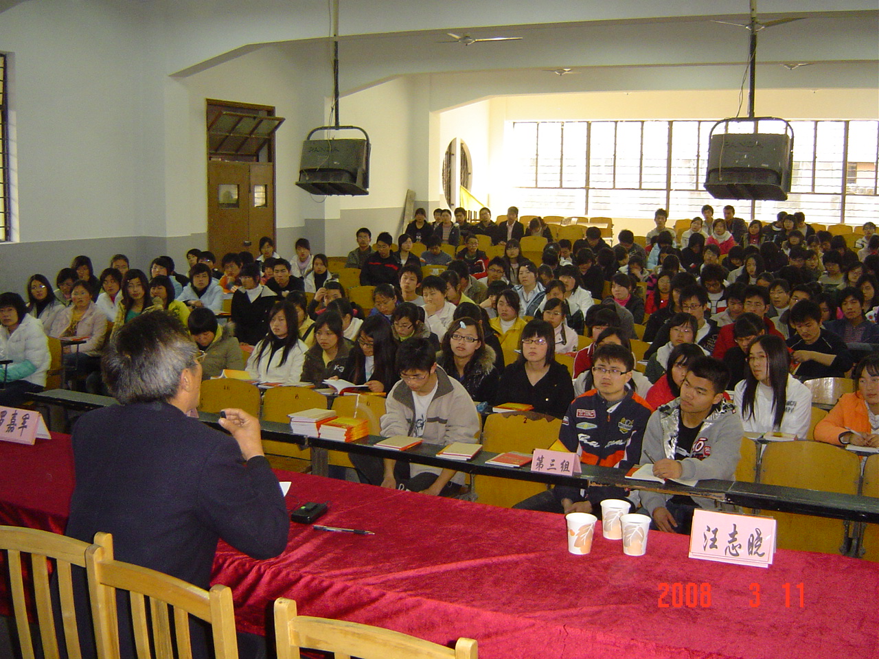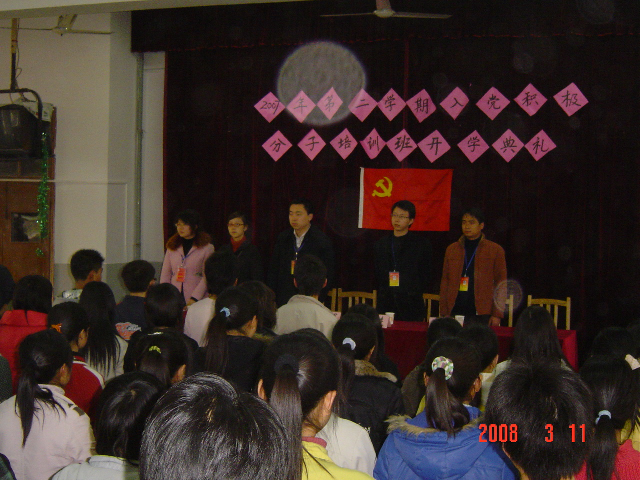 3月11日下午3:30,2007―2008学年第二期入党积极分子培训班在中桥校区实验楼阶梯教室隆重举行开学典礼。经管学院分党校副校长汪志晓、分团委书记徐进和分党校辅导员吴启高、章樱樱老师以及电信学院颜惠琴老师、院党校陶福民老师出席了开学典礼。参加本次培训班的学员共有256人。