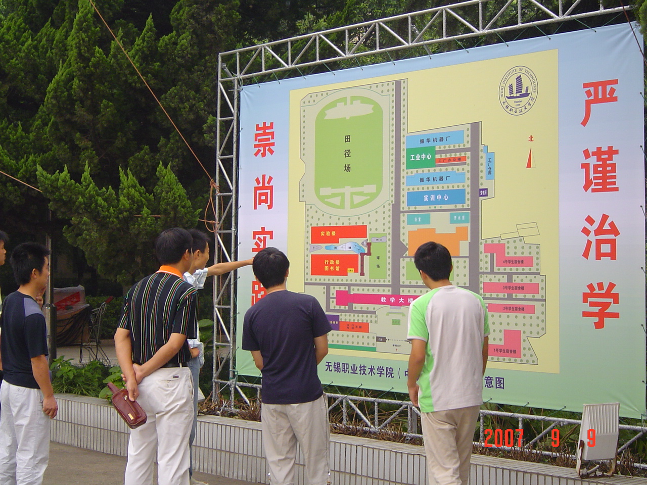 为方便新生报到时熟悉校园环境布局,在中桥校区教学大楼前面布置了一张中桥校区平面示意图(喷绘),将校区的建筑、道路等教学、办公、体育、生活后勤等设施以亮丽的色块表示在平面上,使学生和家长一目了然。这个亮点,很受新生和家长的欢迎。图为新生们正在观看平面图。