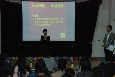 整场活动持续两个半小时,通过15名学生选手的简短的工作、生活介绍、自我亮相(三句话自我介绍)、即兴答题(关于职业生涯规划、职业道德、职业素养、综合素养、道德品质等方面的问题)、企业人士点评、选手对企业人士提问等环节进行职场体验,最终被企业认可,可以选择一家实习或工作的企业。同时活动还评选最具口才奖、最具潜力奖、最具人气奖各1名。