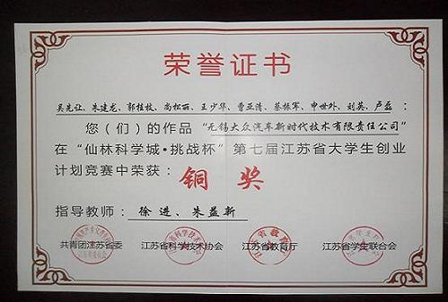 在南京财经大学举办的“仙林科学城—挑战杯”第七届江苏省大学生创业计划大赛上,由我院徐进、朱益新老师指导,营销41091班吴先让、郭桂枝、申世外、王少华、曹亚清、蔡振军、刘英,工商41031班朱建龙,营销41032班尚松丽等同学组成的“无锡大众汽车新时代技术有限责任公司”代表队喜获铜奖。