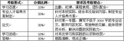培训考核主要从学习态度、专业人才培养方案、专业论文、学习总结、答辩五个方面进行。具体分值及考核要点见表4。