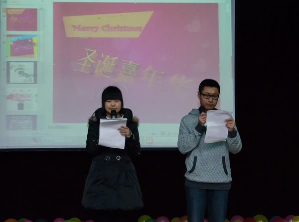 又是一年平安夜,在圣诞歌曲的节奏下,主持人正式宣布活动开始。经管外联部干事一展歌喉拉开联欢会序幕,节目之余主持人还秀上了一段精彩的B-BOX。除了丰富的节目,还有趣味多多的游戏环节,你比划我猜词等等互动性极高的游戏让会场气氛不断活跃起来。兄弟学院也倾情演出,热情参与联欢。现场一派欢乐愉悦的氛围。