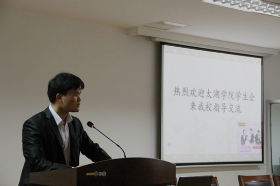 随着会场里欢迎校友到来的音乐播放,校际交流会正式开始了。待双方见面入座后,由主持人致辞欢迎对方校友。接着我方由汤文胜主席上台对太湖学院学生会的到来表示欢迎,然后简单介绍了经管学院学生会的运作模式、概况以及自己的管理经验和工作理念等,并播放事先制作好的PPT、视频。在我方展示完毕后,太湖学院学生会主席上台答谢,并讲解了他们学院学生会的管理经验,之后展示他们的PPT和视频。双方展示完毕后,现场进行自由讨论交流,提出各自运行中所出现的问题,商讨解决方案。活动最后双方留影,这也预示着双方建立了良好的合作关系。