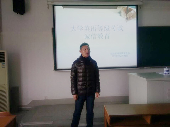 学以载道,诚信为本。大学生英语等级考试及期末考试日益临近,为了加强学风建设,增强同学们的诚信考试意识。辅导员孙台维老师要求营销系2013级各班级组织开展“认真复习,诚信考试”主题班会。12月15日上午10:00,首场班会在连锁41331班举行。