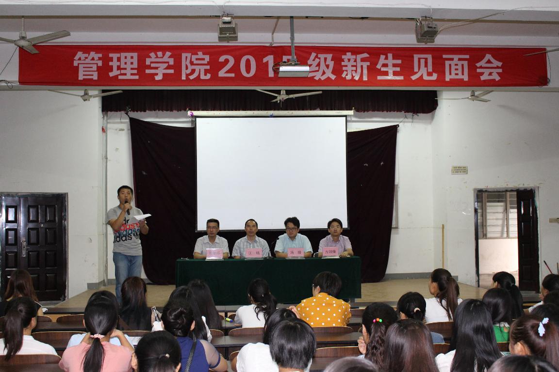 9月14日上午8:10至10:30分,管理学院师生在中桥校区实验楼阶梯教室隆重举行了两场2015级新生欢迎会。参加欢迎会的有管理学院的江铭书记、冯臻副院长、翁爱祥副院长、方锦烽院长助理、辅导员、班主任老师及2015级管理学院市场营销(专科)、工商管理系、物流管理系、电子商务系的全体学生。迎新会分为四个议程,分别是冯臻副院长发言、老生代表发言、新生代表发言、江铭书记致辞。冯臻副院长希望2015级的新生做一个有责任感、有勇气、敢担当、会分享、懂得平衡时间的人。江铭书记结合“三个泥瓦匠”的故事和美国的一项数据调查,告诉新生,对待事情不同的态度,不同的目标定位将成就不一样的人生。最后,江书记对学生提出三点希望,希望学生做一个和谐的人、一个有独立决策能力的人、一个勤劳踏实肯干的人。领导们的发言给新生们指明了目标和努力的方向,我们衷心祝愿同学们在玛雅吧 管理学院的三年学习、生活生涯中能够青春无悔!