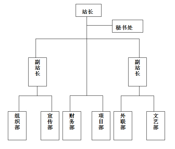 站长一名,副站长两名(必要时可设站长助理一名)。下设秘书处、财务部、组织部、文艺部、外联部、宣传部等部门。各部实行部长负责制,各部设部长、副部长一名,干部、会员若干。