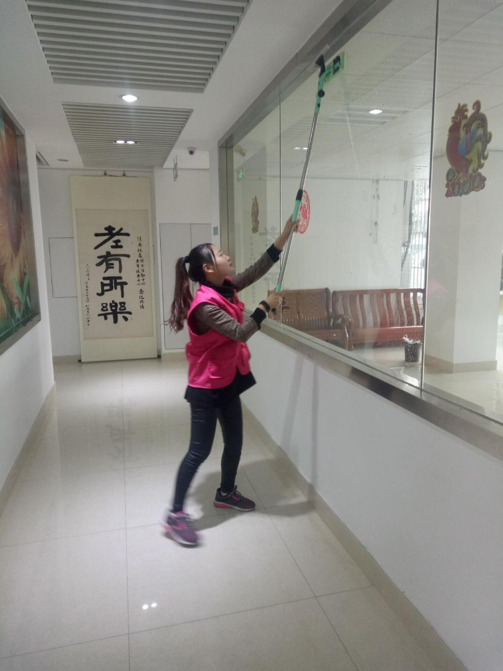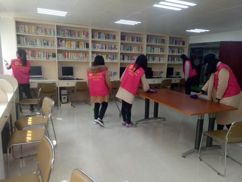活动开始是将到来的志愿者们分出两部分分别对一楼二楼进行打扫,对于一楼地面的拖洗,则由男生同学来完成,擦洗室内设施则由女生同学来完成。在大家齐心协力的合作下,终于将社区上下打扫的干干净净。