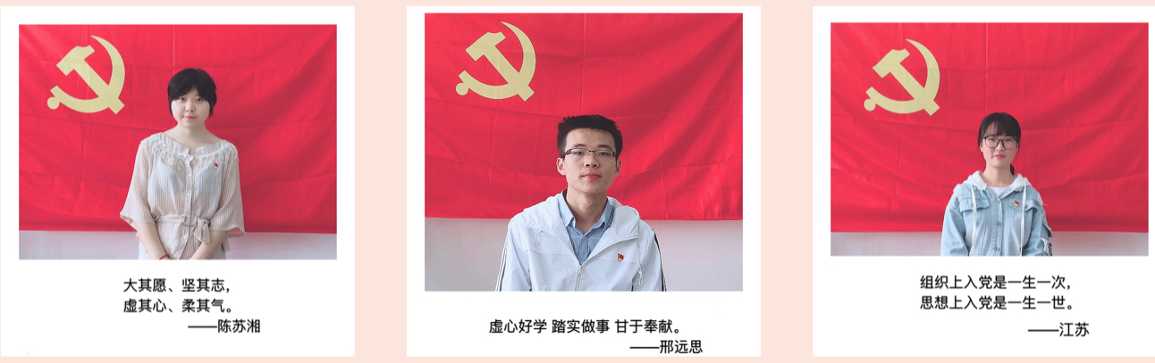 会议开始,由徐进同志宣布党员到会情况并宣读会议议程。本次发展对象是陈苏湘、邢远思和江苏三位同学。首先,三名发展对象分别宣读入党志愿并根据需要向党组织说明了有关问题。其次,入党介绍人介绍各申请人的情况,提出接收以上同志为预备党员的意见,支部其他成员充分发表了意见。支部有表决权的正式党员投票表决,一致同意三位同志加入中国共产党。最后,三位预备党员面对党旗庄严宣誓,由支部书记颁发党徽。三位新党员对今后的思想、学习、工作和生活表明了决心和态度。