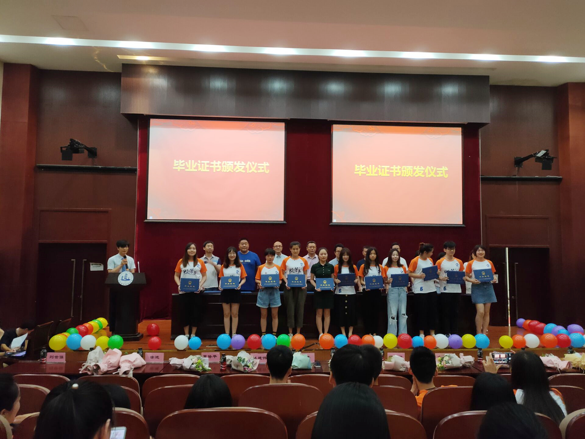 6月21日上午12时,管理学院2019届毕业证发放仪式在国教一楼报告厅隆重举行。管理学院党总支苗勇书记、冯臻院长、郑爱翔副院长、院长助理方锦烽老师、电商系主任赵建伟老师、工商系主任瞿孙平老师、电子商务系彭成圆老师、学工办朱琳老师、学工办徐进老师、班主任王坤老师、班主任赵焕焕老师及管理学院2019届全体毕业生共同参加了本次仪式,刘世强老师担任主持人。本次毕业证书颁发仪式包括师生谊、同学缘、母校情三个篇章。