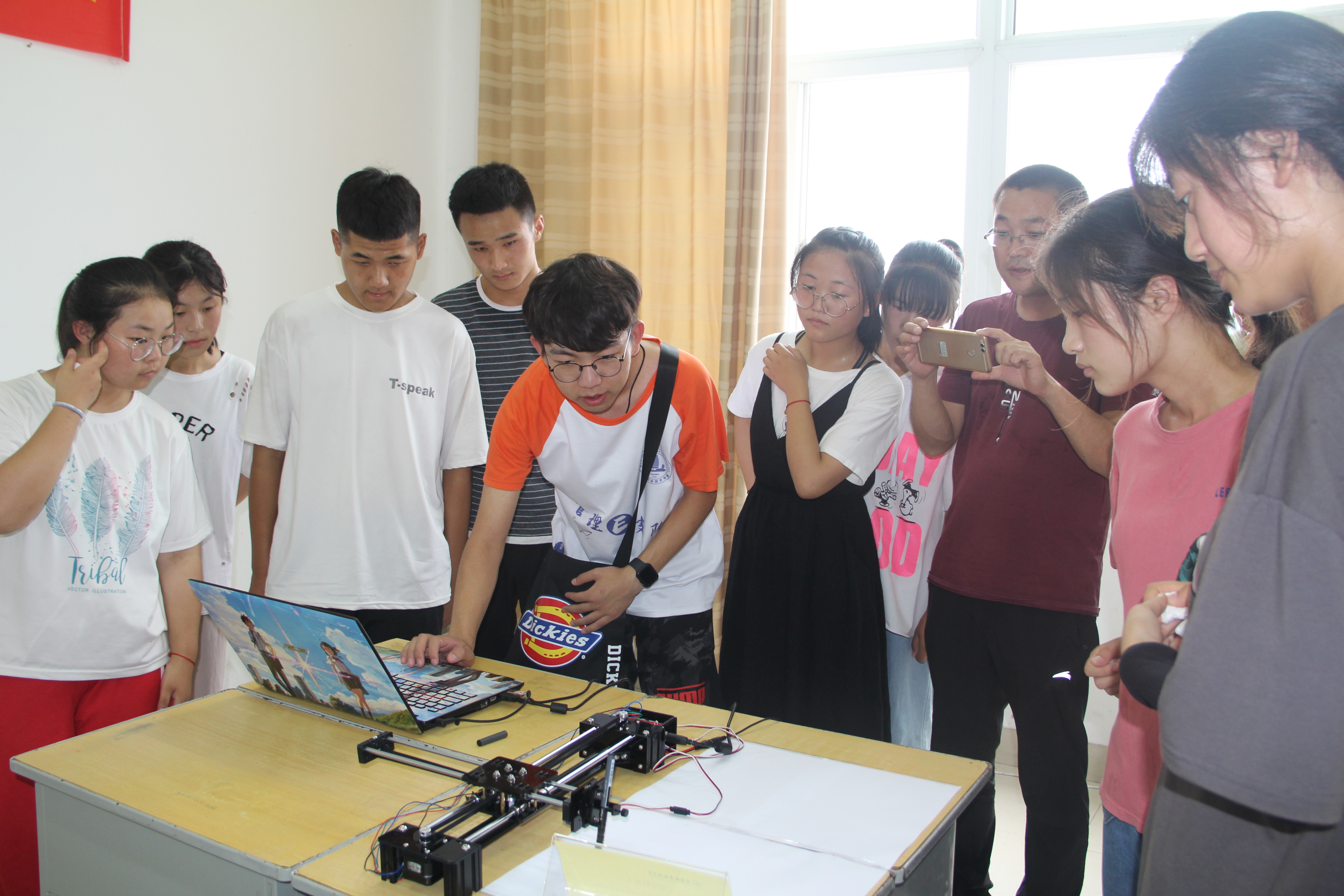 志愿者张少帅同学为前来参加科技交流的同学们介绍并演示了写字机器人。机器人系统主要由下位机和上位机构成,下位机用于执行上位机发过来的数据信息,上位机用于将图像或者文字信息,转换为G代码,发送至下位机。