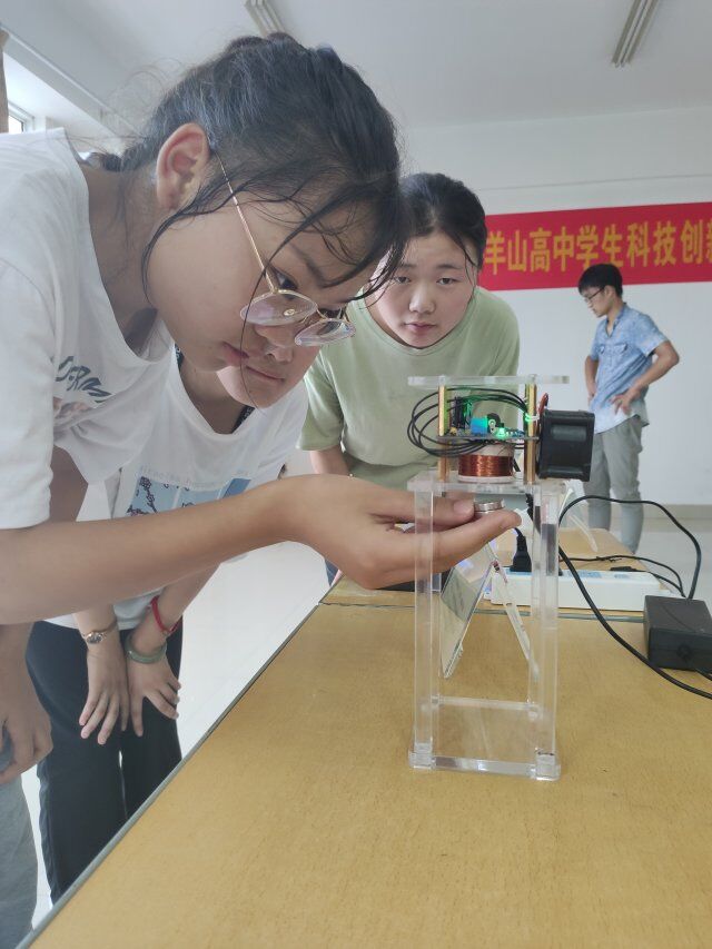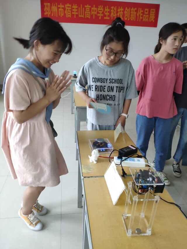 下午2时,宿羊山高级中学有六十多位同学来到科技展厅参加本次科技交流活动,管理E支队志愿者给到场的同学们详细介绍了科技作品的原理并逐个进行演示。