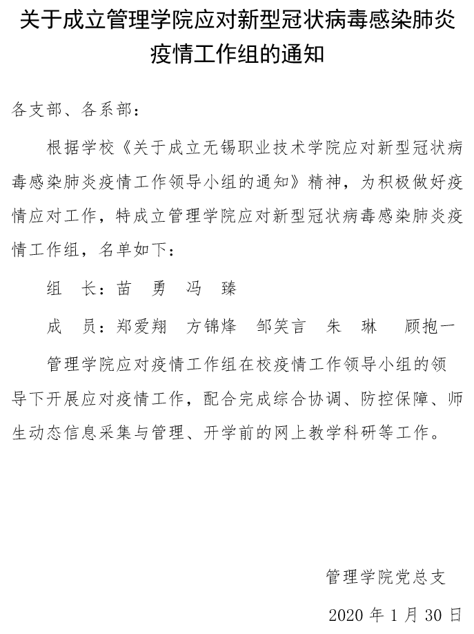 关于成立管理学院应对新型冠状病毒感染肺炎疫情工作组的通知