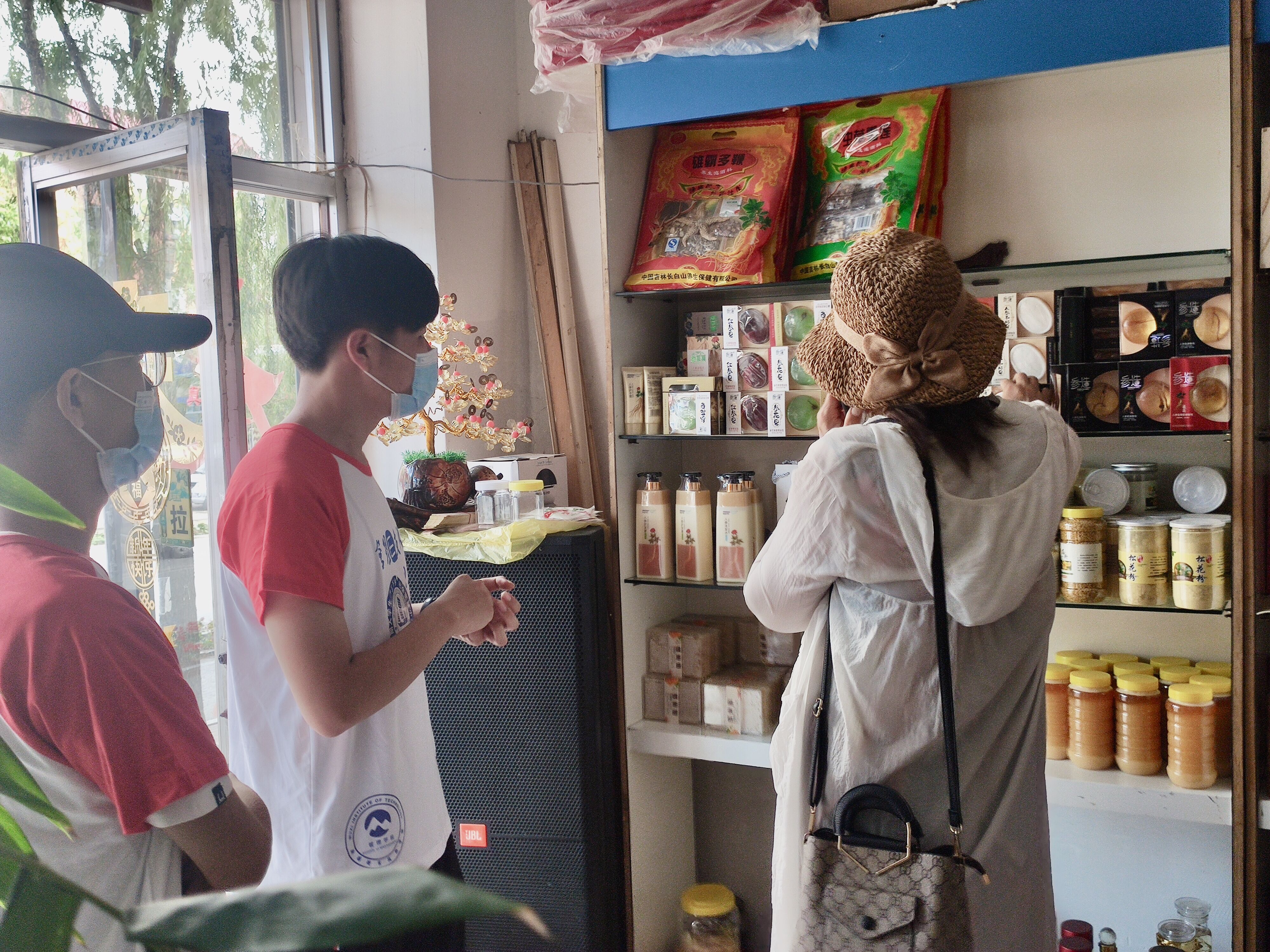 管理E支队队员随后来到泉阳镇乡村集市,先后走进汇林土特产专卖店、深山极品山货庄、鸿源土特产药材购销站等多家商户与农户进行详细交谈。汇林土特产商户林女士告诉志愿者队员,今年受疫情影响大家的生意都不好做,滞销囤积的货物太多,本想对人参进加工制成人参皂膏和人参面膜等新产品,以此迎合来东北吉林旅游客人们对于纪念品或者新奇货物的需求,但没想到疫情的爆发,旅游业因此受到牵连,这使得大伙对于货物销售更加灰心丧气。泉阳镇的人参产量丰富,本地农民对于今年的人参成色评价还不错,商户们也开始尝试主动寻找产品创新,创造出更多高质量的人参衍生制品,不料却因2019年末突如其来的疫情,使得泉阳乡村致富之路被搁浅,实在令人惋惜!